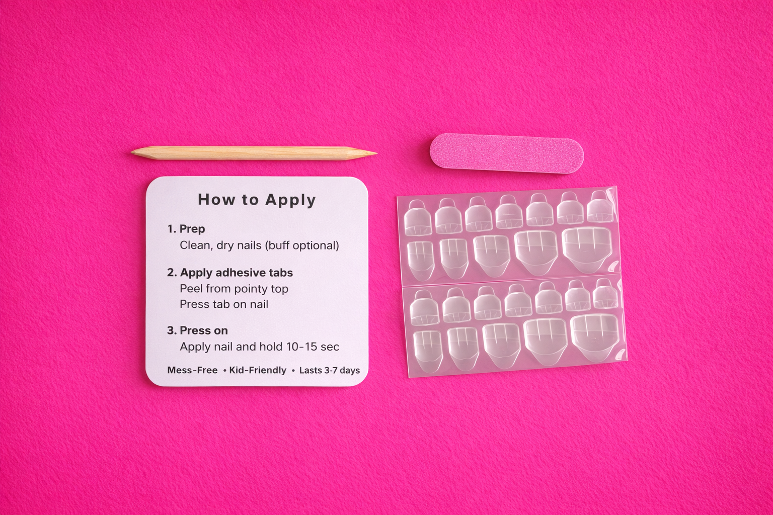 Each set includes adhesive tabs, a mini nail file, a cuticle stick, and easy-to-follow instructions on the back of the card.